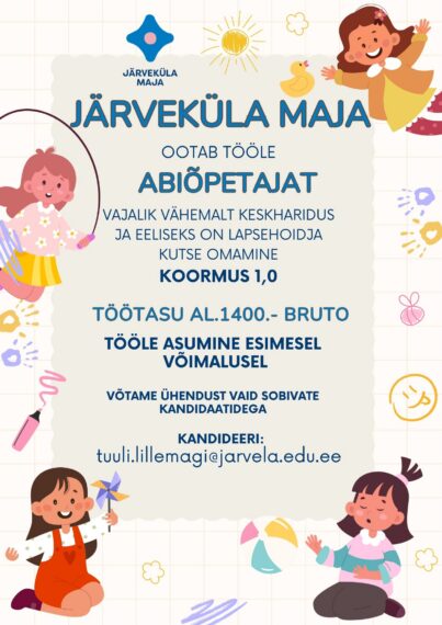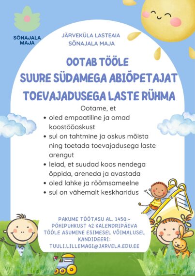 Kui Teid huvitab uus töökeskkond, inspireerivad kolleegid, põnevad väljakutsed ja toredad Väikesed Inimesed ning omate ettevalmistust järgmiste töökohtade täitmiseks (või teate kedagi, keda antud tööpakkumine võiks huvitada):