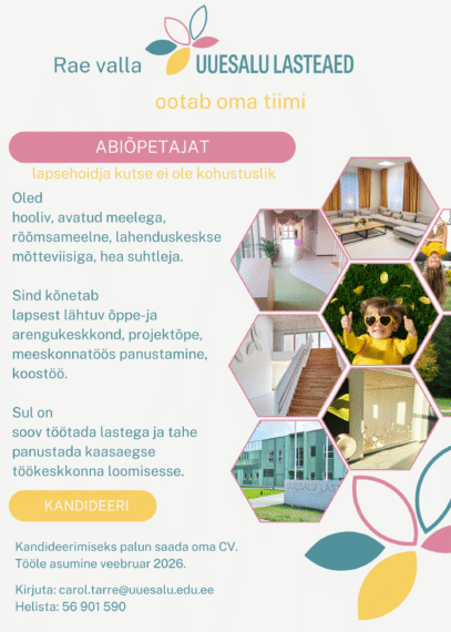 Abiõpetaja, ootame Sind oma tiimi! Väärtustame lapsepõlve loomulikku rütmi. Usume, et laps vajab aega mängimiseks, avastamiseks ja süvenemiseks. Päevad kulgevad rahulikult, pakkudes ruumi keskendumiseks, loovuseks ja turvalisteks suheteks. Loome koos lasteaeda, kus laps tunneb end oodatuna.